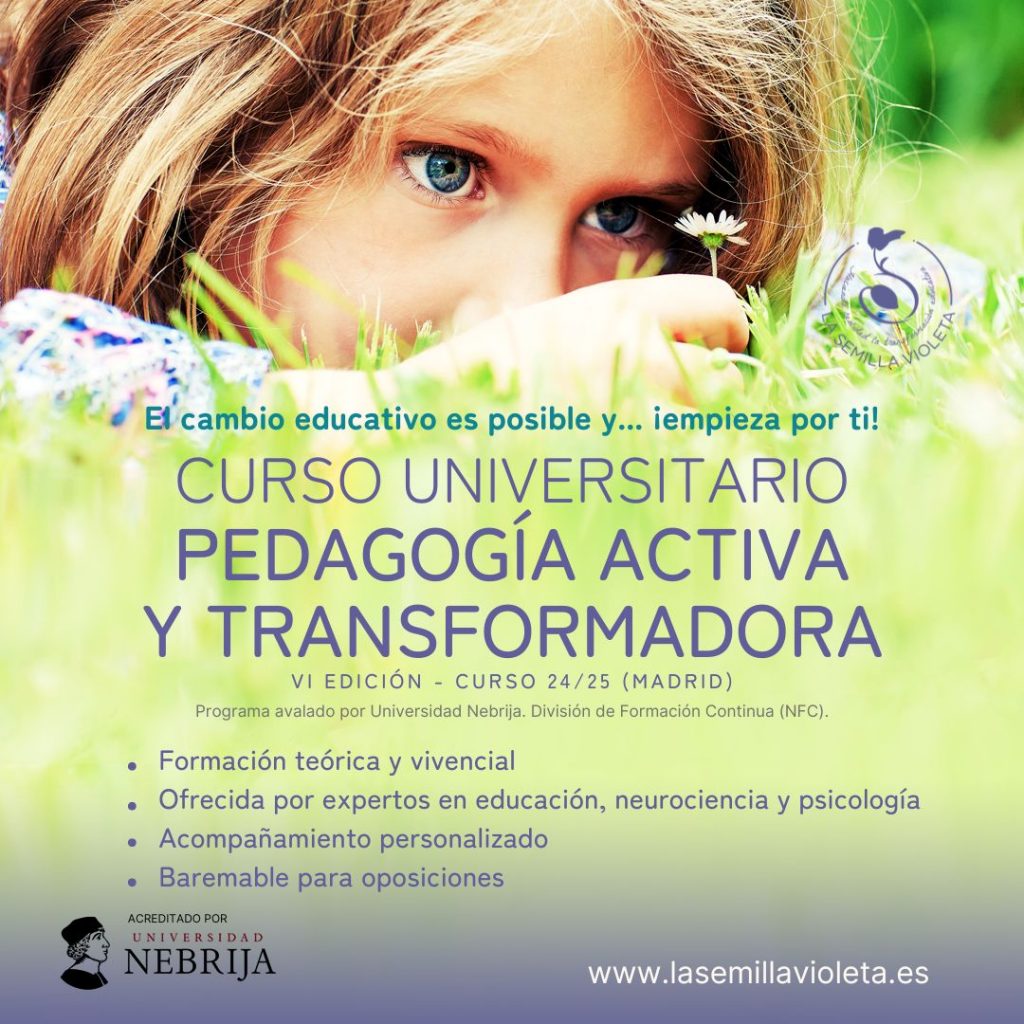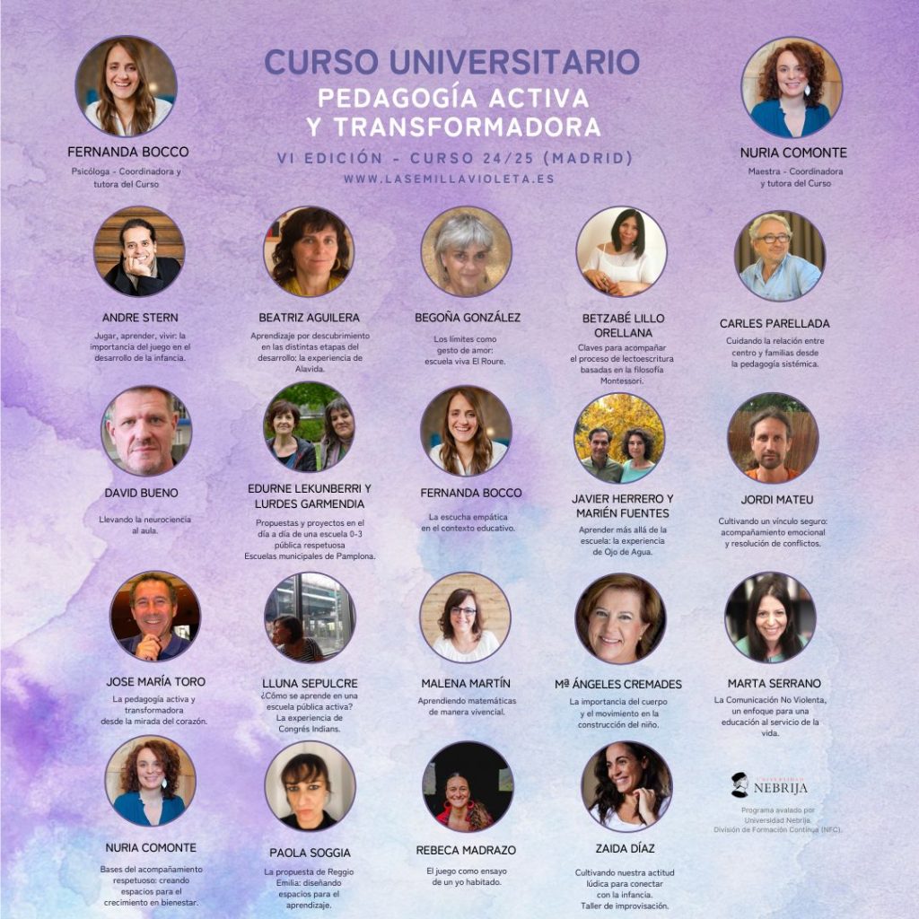 Un año más, participamos en el Curso Universitario en Pedagogía Activa y Transformadora ofrecido por La Semilla Violeta y acreditado por la Universidad de Nebrija.