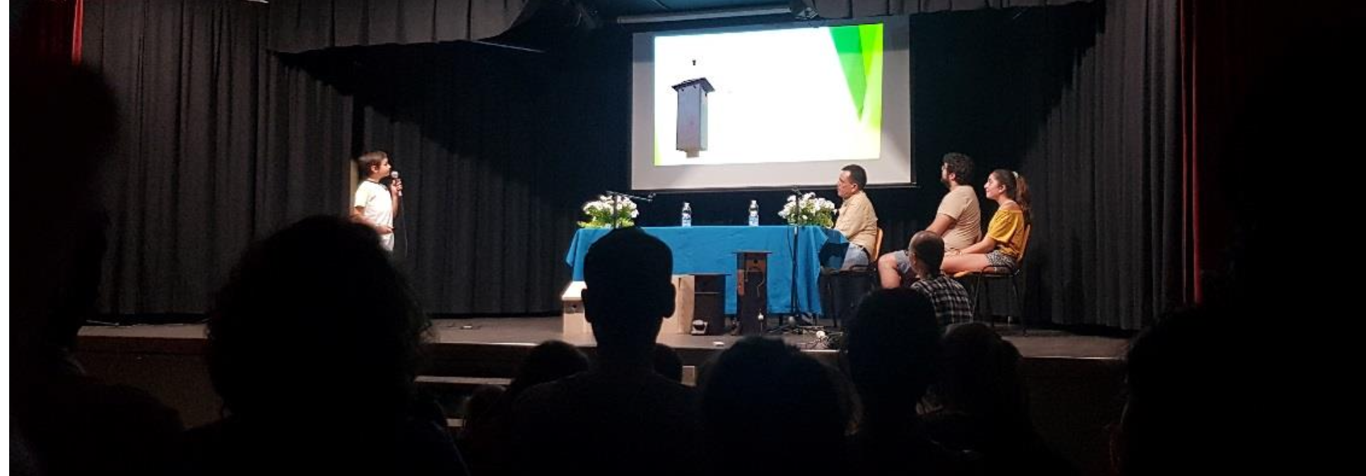 (Un participante del Taller de Ciencias Naturales de ojo de agua explica el proyecto en la Casa de Cultura de Orba. En el escenario, Paco Volante, creador de las cajas de biodiversidad desplazado desde Huelva para la presentación, Guillem Marhuenda, concejal de cultura y otra participante. Con camisa a cuadros, David Cartagena, padre, biólogo y coordinador del Taller de Ciencias Naturales.)