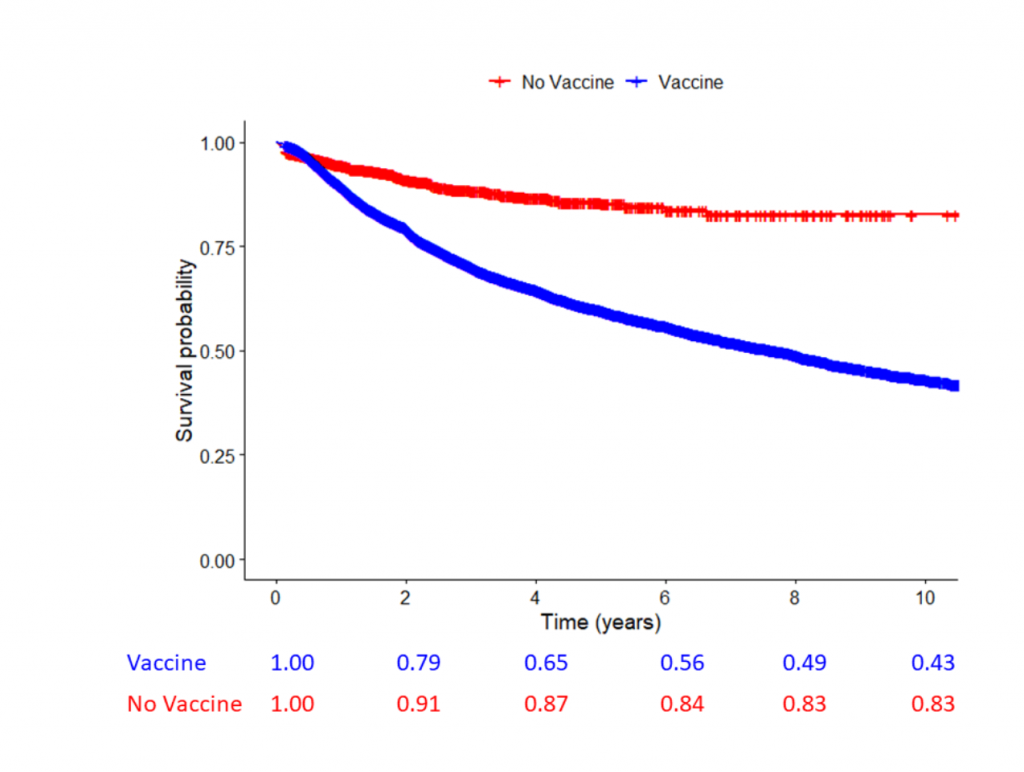 “Este estudio descubrió que la exposición a la vacunación estaba asociada de forma independiente con un aumento general de 2,5 veces en la probabilidad de desarrollar una enfermedad crónica, en comparación con los niños no expuestos a la vacunación.” (5)