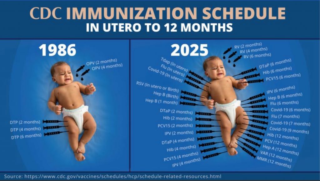 El informe del representante del ICAN acaba con la siguiente imagen de la evolución del calendario vacunal infantil desde la concepción hasta el primer año de vida en los EE.UU.