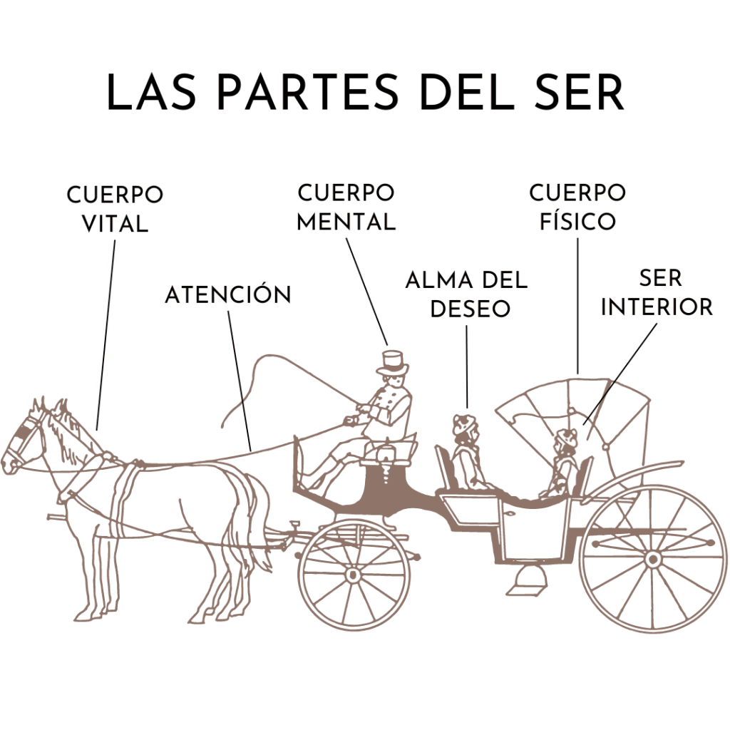 “Cuando el cochero (mente) esta confundido y no sabe a dónde ir, el carruaje (cuerpo) es impulsado por los caballos (emociones) que automáticamente lo tiran, sin ninguna dirección, mientras el pasajero (conciencia del alma) duerme. Y si ésta duerme ¿Cuánta consciencia podemos tener sobre lo que hacemos, decimos y decidimos? ¿Cómo puede el cochero dar instrucciones adecuadas a los caballos si no sabe a dónde ir? Para saber a dónde ir necesitas escuchar la voz del pasajero (alma), para poder tomar el control y llevar los caballos a la dirección deseada. ¿Crees que no es así? Piensa en cuantas acciones y pensamientos haces sin usar tu conciencia”.